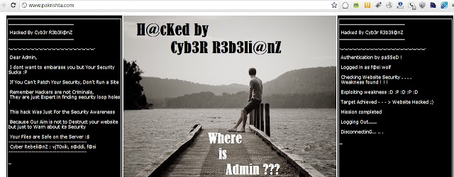 Pakistani Matrimonial Website ‘PakRishta.com‘ defaced by Hacker name “Cyb3r R3b3li@nZ” . Hacker said “This site is just hacked to inform the admin to remove the file uploading vulnerabilities in the profile picture uploading. This vulnerability allow the attacker to upload any malicious file on the server.”