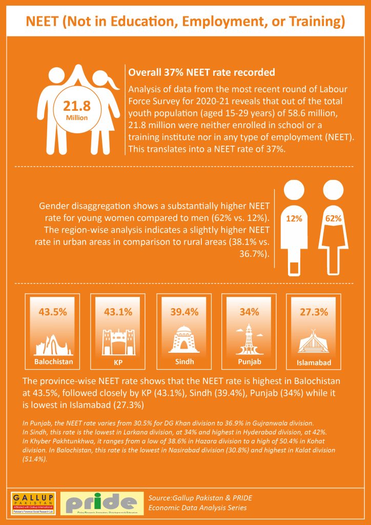 Research conducted by Gallup Pakistan and PRIDE, using data from the Labour Force Survey 2020-21 shows that 21.8 million youth (aged 15-29) is neither in education, nor in training and nor in employment.