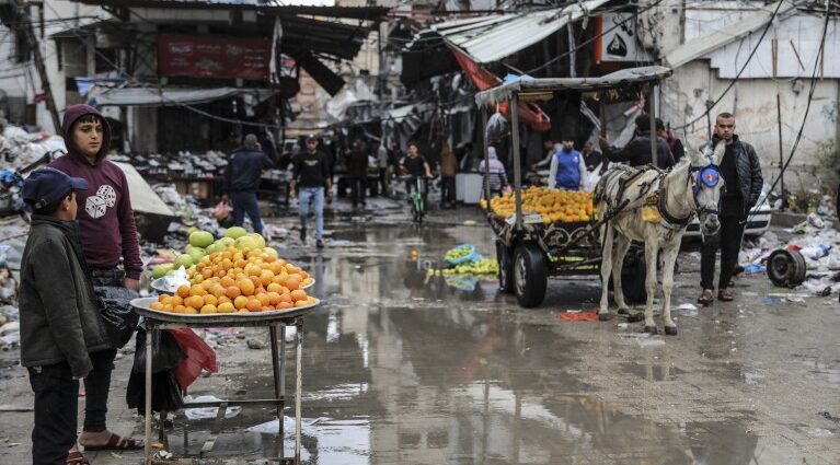 Palestinians sell fruits in Gaza City on Monday, Nov. 27, 2023. on the fourth day of the temporary ceasefire between Hamas and Israel. (AP Photo/Mohammed Hajjar)
