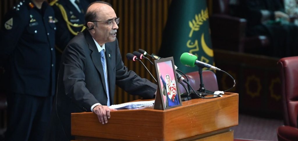 “I believe we can reset the political atmosphere to reflect more light than heat if we really want to, but it will need all of us to step back and decide what matters the most, and I mean all of us. At the end of the day, it is up to all of us to turn challenges into opportunities, because that is what robust nations do. I have always drawn inspiration and guidance from great leaders such as Quaid-e-Azam Muhammad Ali Jinnah, Shaheed Zulfiqar Ali Bhutto, and Shaheed Mohtarma Benazir Bhutto, who spent their lives being advocates for democracy, tolerance, and social justice. I firmly believe that by embracing the vision of these leaders, we can effectively tackle our challenges and foster an atmosphere of mutual respect and political reconciliation. The challenges we face are not impossible to overcome. They just require the fundamentals of meaningful dialogue, parliamentary consensus and a time-lined implementation of rigorous reforms aimed at addressing the underlying issues, both old and new, confronting us. I strongly believe that in order to align our country with the 21st century, it is imperative that we move forward on reforms to promote good governance for the provision of optimal social entitlements to our citizens. Let’s begin with a vision that strives to leave no one behind. For this thought to move beyond an idea, the political leadership gathered in this house must prioritise the specific needs of marginalized communities and underdeveloped areas. By focusing on the needs of these regions, we can bridge the gap between them and the more developed areas of the country, moving the needle towards an inclusive growth model that emphasizes equality of opportunity” President Asif Ali Zardari said.
