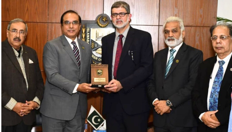 A thirteen-member delegation of the Europe Pakistan Economic Corridor (EPEC), led by its Founder and CEO Dr. Abdul Hafeez MBE, visited the Islamabad Chamber of Commerce and Industry (ICCI) and held a detailed meeting with ICCI Acting President Tahir Ayub and Vice President Mohammad Irfan Chaudhry. The purpose of the visit was to explore avenues of collaboration aimed at unlocking new trade and investment opportunities between Europe, Pakistan, and other international markets.