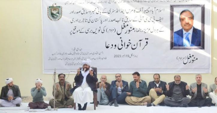 ICCI President Sardar Tahir Mehmood, Senior Vice President Tahir Ayub, Vice President Irfan Chaudhry, Chairman Founder Group Shaikh Tariq Sadiq,  former Presidents  Abdul Rauf Alam, Zubair Ahmed Malik, Zafar Bakhtawari,  Mian Akram Farid, Muhammad Ejaz Abbasi, Mian Shaukat Masud, Khalid Javaid, Khalid Iqbal Malik, Ahsan Zafar Bakhtawari, Executive Committee Members,  President All Pakistan Anjuman-e-Tajran Ajmal Baloch, Secretary General CDA Employees Union Chaudhry Mohammad Yasin, Markets Presidents, General Secretaries,  business leaders  and family members of late Munawar Mughal participated in the Quran Khawani.
